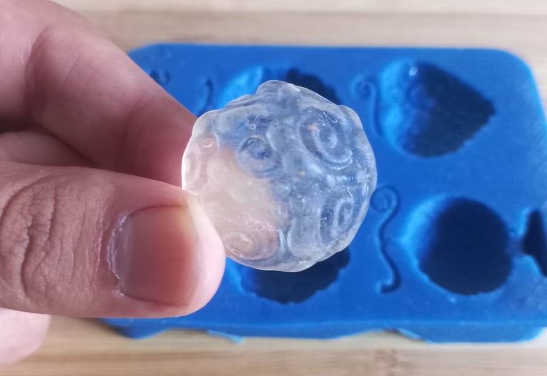 Una vez listo el molde, llegó el momento de la resina epoxi. Mezclamos los componentes con sumo cuidado y vertimos la pasta en el molde, dejando que fluyera y llenara cada recoveco. Tras un tiempo de espera, descubrimos la pieza: una gema traslúcida, pulida y lista para sorprender.